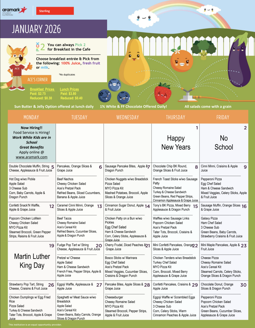 There are always 4 lunch choices: cold lunch (bring lunch from home), deli sub, SBJ, & a hot item (changes daily).