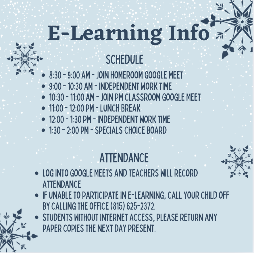 In the event the district uses an E-Learning day, please refer to the graphic below for our schedule and attendance during those days. If you have any questions, please don't hesitate to reach out! For more information about E-Learning, please review the parent letter or the District E-Learning Plan. |